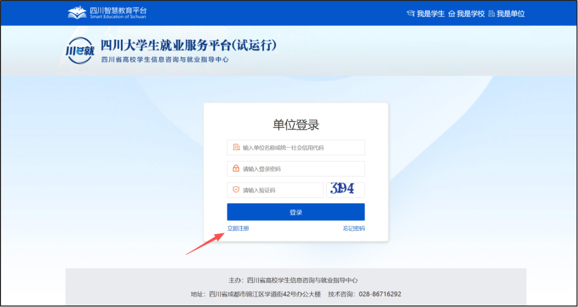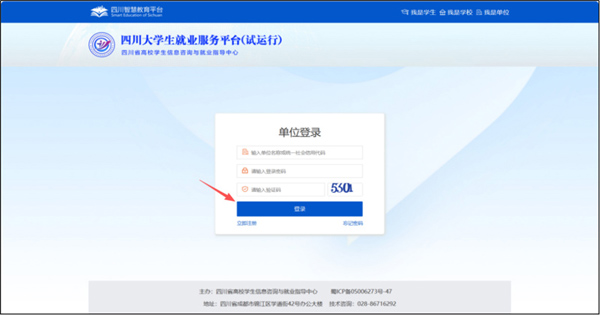 打開“川e就—四川大學(xué)生就業(yè)服務(wù)平臺”,網(wǎng)址:https://bigdata.scbdc.edu.cn:8888,點(diǎn)擊【單位登錄】,打開單位登錄頁面。(已注冊單位可直接登錄,報(bào)名線上招聘會,發(fā)布職位)