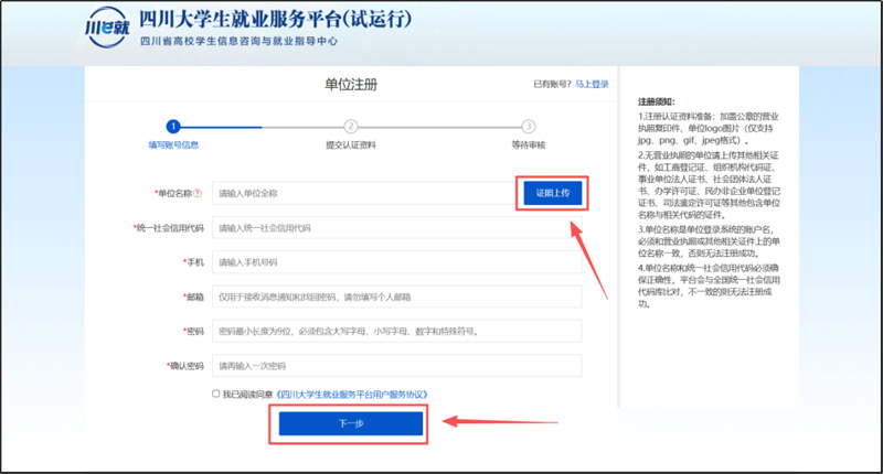 首次使用系統(tǒng),需要提供單位統(tǒng)一社會信用代碼、營業(yè)執(zhí)照掃描件等信息進(jìn)行注冊,點(diǎn)擊【立即注冊】。