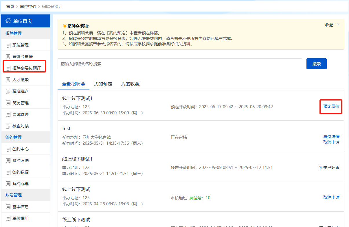 登錄成功之后,在單位首頁選擇【招聘會展位預(yù)定】,搜索“智匯天府 興業(yè)內(nèi)江”公共招聘進(jìn)校園活動暨內(nèi)江衛(wèi)生與健康職業(yè)學(xué)院2026屆畢業(yè)生春季雙選會,點(diǎn)擊【預(yù)定展位】。