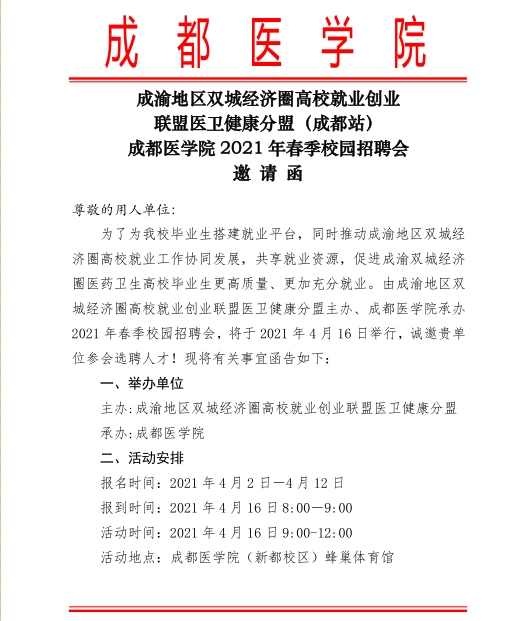成都醫(yī)學(xué)院2021年春季校園招聘會(huì)邀請(qǐng)函