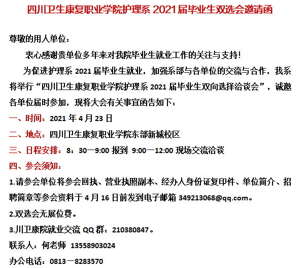 > 四川衛(wèi)生康復職業(yè)學院護理系2021屆畢業(yè)生雙選會邀請函
