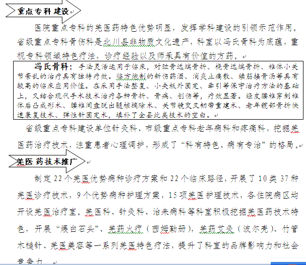 醫(yī)院注重以科研促產(chǎn)業(yè)升級(jí),開(kāi)發(fā)羌醫(yī)藥養(yǎng)身產(chǎn)品,現(xiàn)已獲得食品批號(hào)14項(xiàng),并已投入生產(chǎn)試驗(yàn)階段;以學(xué)術(shù)帶學(xué)科發(fā)展,在北川地區(qū)多次舉辦羌醫(yī)藥學(xué)會(huì),促進(jìn)羌醫(yī)藥學(xué)術(shù)交流,帶動(dòng)學(xué)科發(fā)展,大力申報(bào)羌醫(yī)藥相關(guān)項(xiàng)目,現(xiàn)已立項(xiàng)科研項(xiàng)目共計(jì)14項(xiàng),其中國(guó)家級(jí)1項(xiàng),省部級(jí)8項(xiàng),市級(jí)4項(xiàng),縣級(jí)1項(xiàng);加強(qiáng)羌醫(yī)藥適宜技術(shù)的研究學(xué)習(xí),并在院內(nèi)積極推廣應(yīng)用。