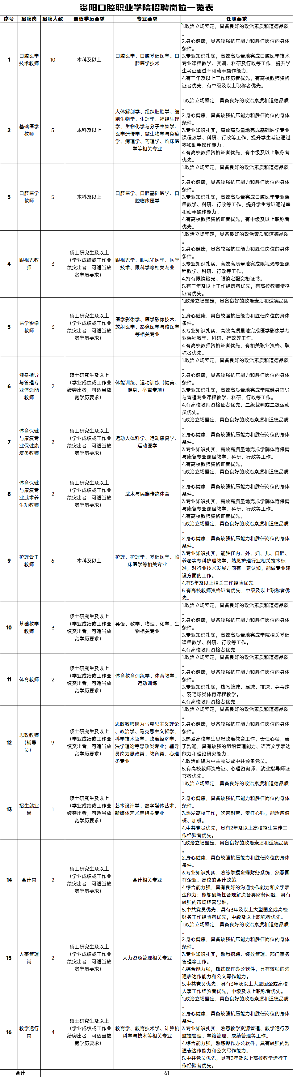 本次招聘崗位包括口腔醫(yī)學教師、口腔醫(yī)學技術教師、基礎醫(yī)學教師、護理教師、教學運行、會計、人事管理等16個崗位、61人,詳見《資陽口腔職業(yè)學院招聘崗位一覽表》(附件1)。