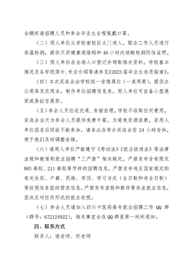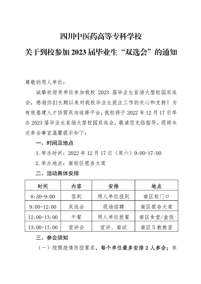 關(guān)于到校參加四川中醫(yī)藥高等??茖W(xué)校 2023屆畢業(yè)生雙選會(huì)的通知(用人單位)
