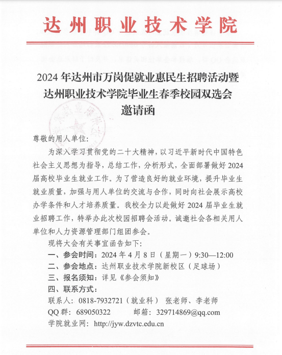 2024年達(dá)州市萬崗促就業(yè)惠民生招聘活動(dòng)暨達(dá)州職業(yè)技術(shù)學(xué)院畢業(yè)生春季校園雙選會(huì)邀請函
