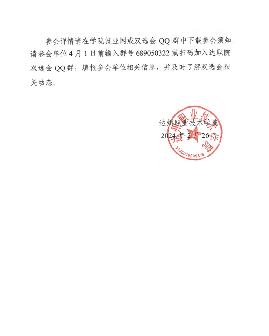 > 2024年達(dá)州市萬崗促就業(yè)惠民生招聘活動(dòng)暨達(dá)州職業(yè)技術(shù)學(xué)院畢業(yè)生春季校園雙選會(huì)邀請函