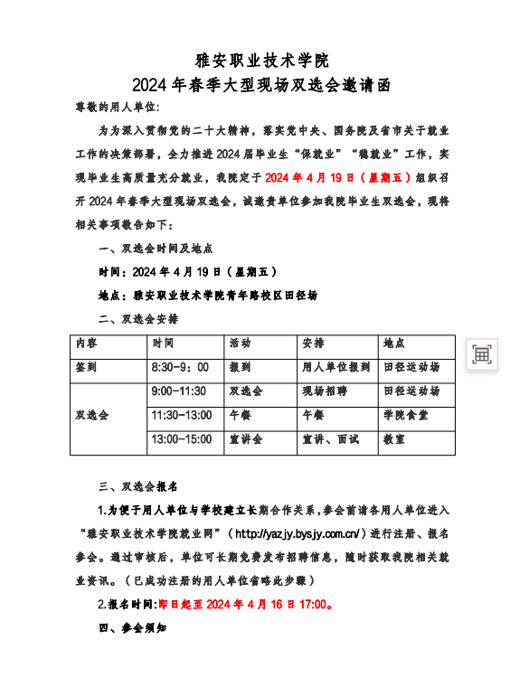 雅安職業(yè)技術(shù)學(xué)院2024 年春季大型現(xiàn)場雙選會邀請函