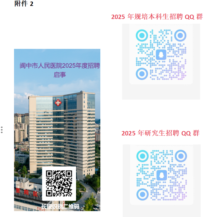 (三)報名方式:應(yīng)聘者將個人簡歷及相關(guān)資料發(fā)送至508467795@qq.com郵箱后,按類別掃碼進(jìn)入“2025年規(guī)培本科生招聘QQ群”和“2025 年研究生招聘QQ群”(見附件2),同時在線填寫“應(yīng)聘登記表”,完善應(yīng)聘信息(見附件2)。