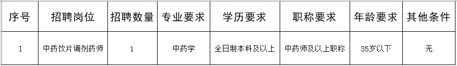 根據醫(yī)院工作需要,現面向社會公開招聘中藥飲片調劑藥師1人,具體要求公告如下: