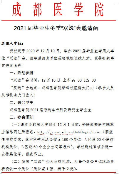 > 成都醫(yī)學(xué)院2021屆畢業(yè)生冬季“雙選”會(huì)邀請(qǐng)函