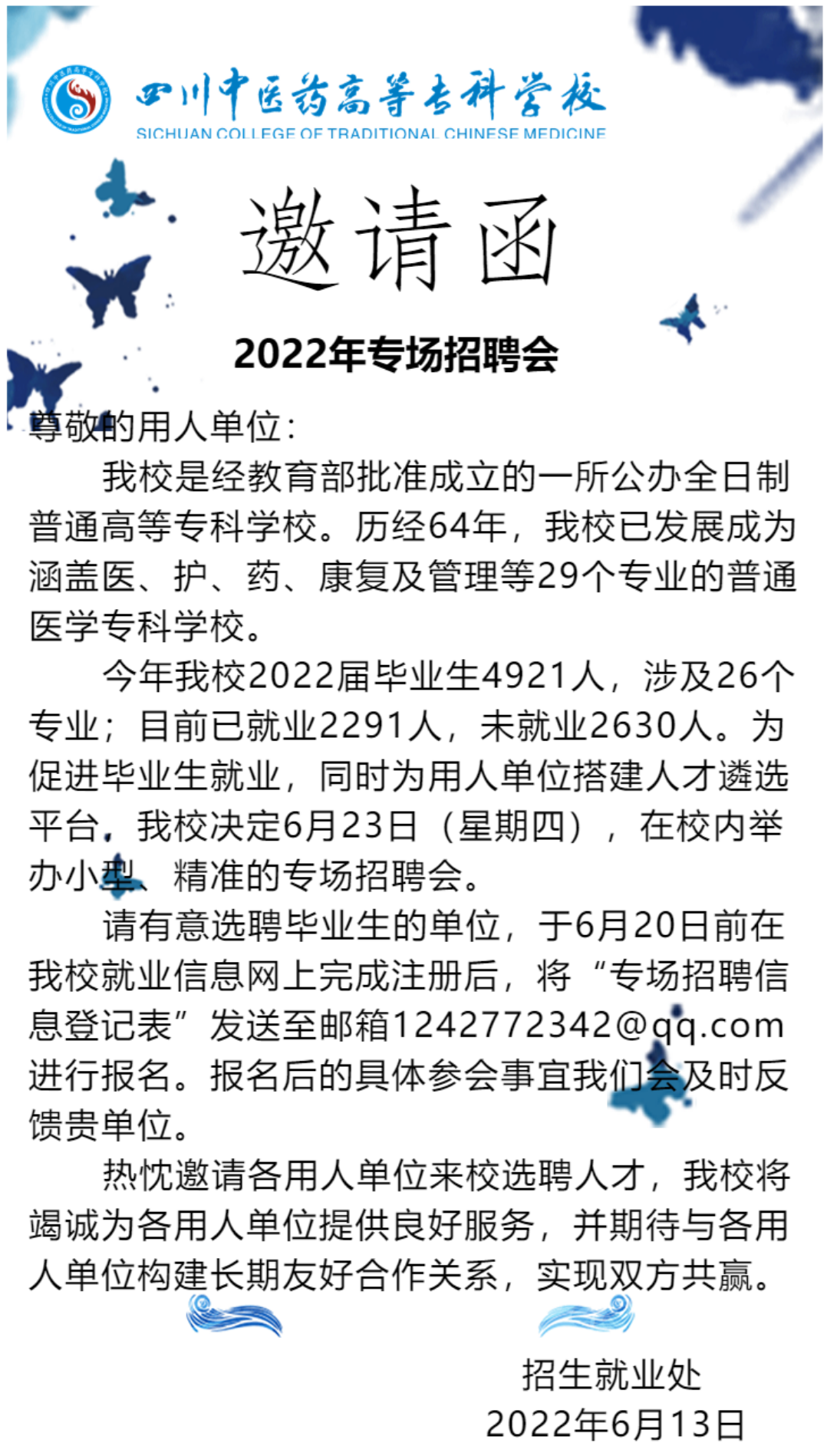 四川中醫(yī)藥高等??茖W(xué)校2022年專場(chǎng)招聘會(huì)邀請(qǐng)函