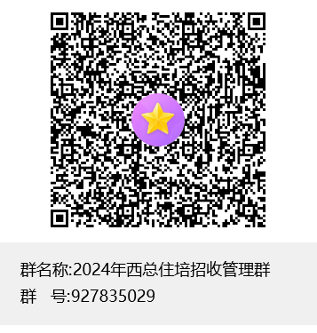 咨詢方式:加入“2024年西總住培招收管理群”QQ群:927835029。因群容量有限,僅限考生加入,所有入群考生務(wù)必及時修改群名片為“報考專業(yè)+真實(shí)姓名”,未按要求更改者將被清退。掃描以下二維碼加入:
