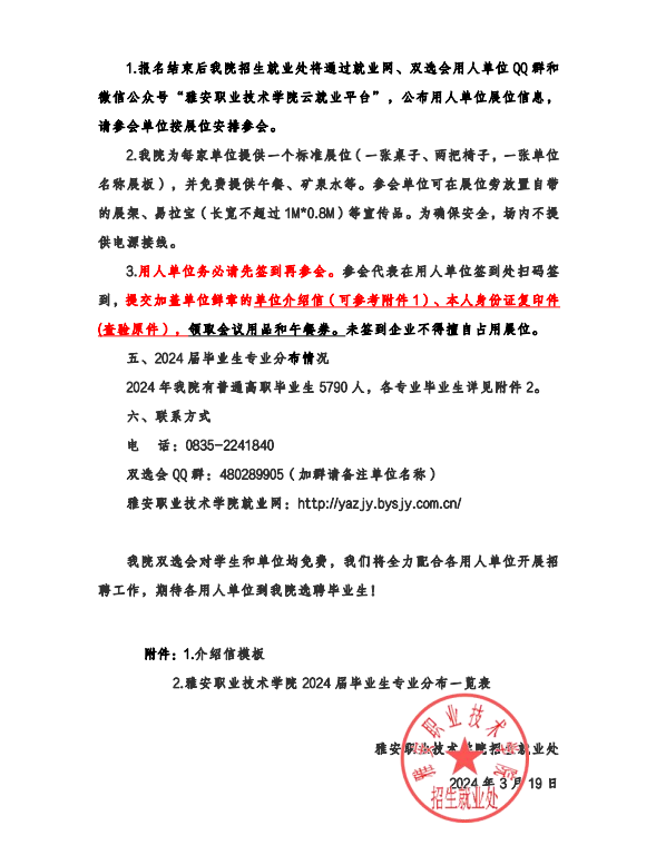 雅安職業(yè)技術(shù)學(xué)院2024 年春季大型現(xiàn)場(chǎng)雙選會(huì)邀請(qǐng)函