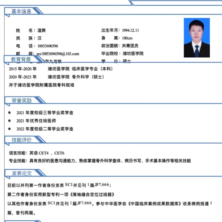 工作描述:骨科常見病的收治,病歷書寫,常規(guī)查體,關節(jié)置換,肩膝關節(jié)鏡,交叉韌帶重建,常見骨折等手術準備