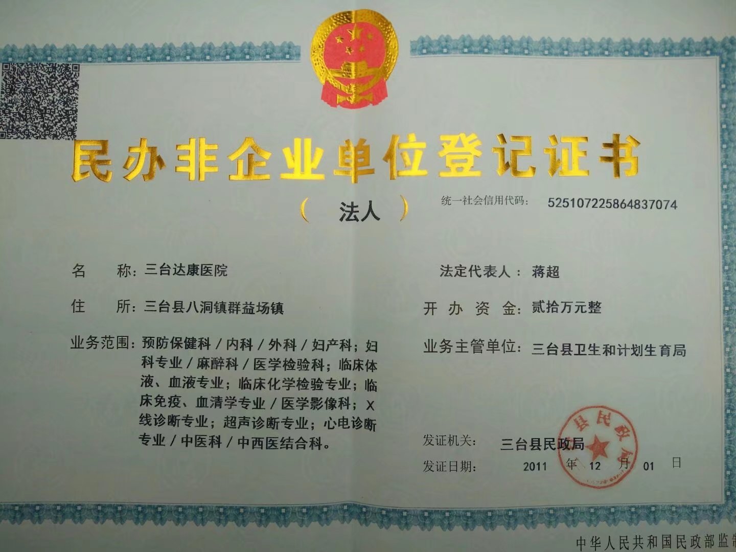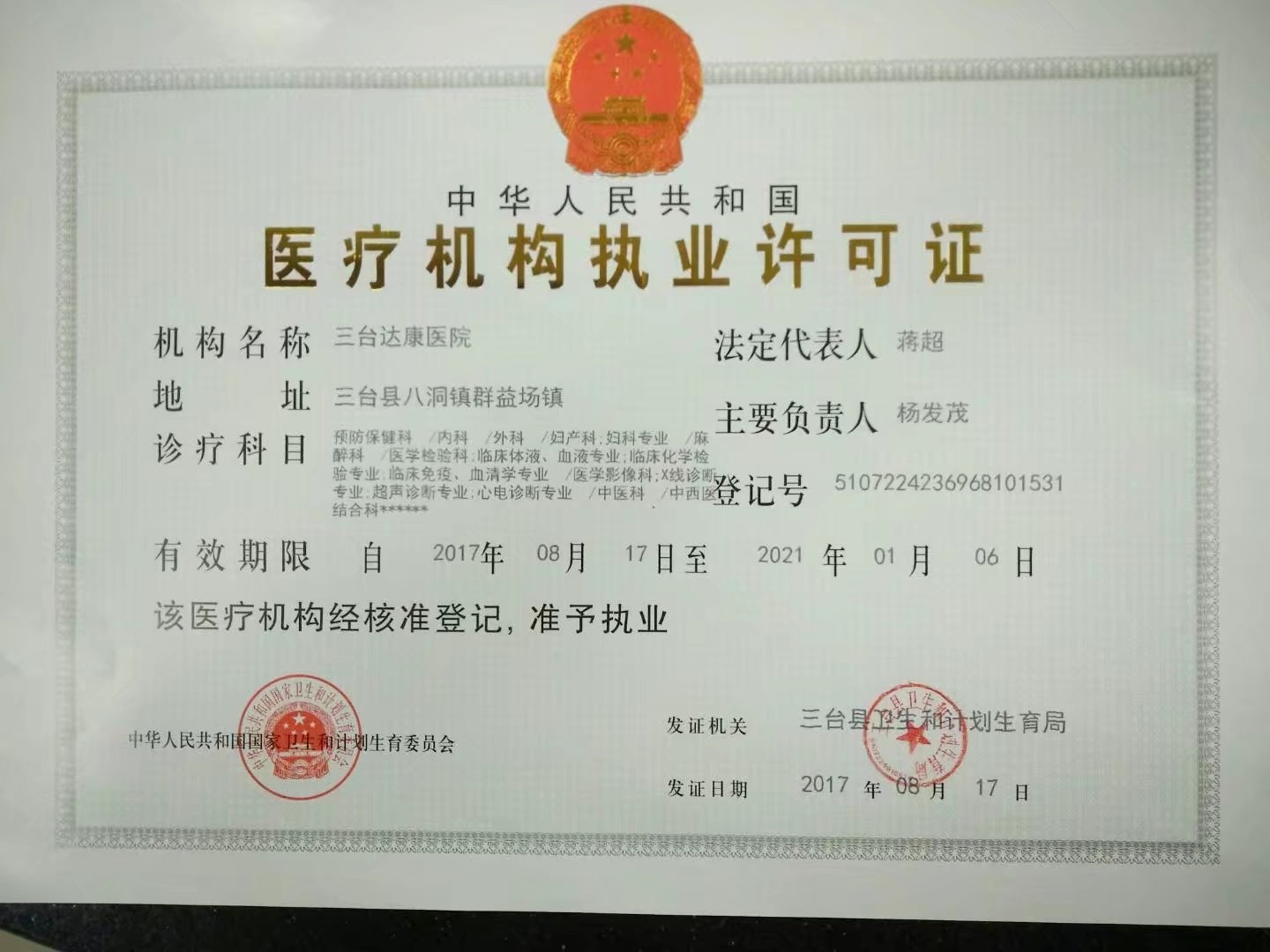 三臺達康醫(yī)院地處三臺縣龍井場鎮(zhèn),是衛(wèi)生行政主管部門2011年批準(zhǔn)的一所非營利性綜合醫(yī)院,2012加入年國家新農(nóng)合定點醫(yī)院。現(xiàn)為國家《城鎮(zhèn)職工、城鄉(xiāng)居民醫(yī)療保險定點機構(gòu)》